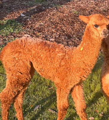 "Sunny" is a friendly guy with beautiful golden (md fawn) fiber. He was born 1/12/24. His mother is La Finca's Mirage a very fine animal well into her 8th shearing. His sire is On the Mark whose got so much fiber that is dense and lofty.